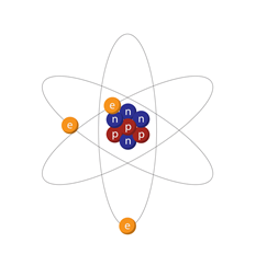 Modell eines Atoms; innen: Kern mit Protonen (p) und Neutronen (n); außen: Elektronen (e) (Quelle: https://commons.wikimedia.org/wiki/File:Atom_animation.gif )